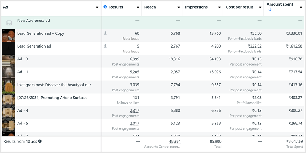 Generated over 5.7 million in reach and 15 million impressions, resulting in 42,450 link clicks and 5,756 leads/engagements at varying costs per result, with a total spend of ₹256,643.54.