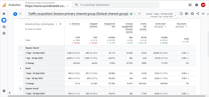 The client, Sunvik Steels, onboarded with a primary goal of improving their website’s organic visibility, increasing keyword rankings, and driving higher organic traffic to generate better brand presence and inquiries.